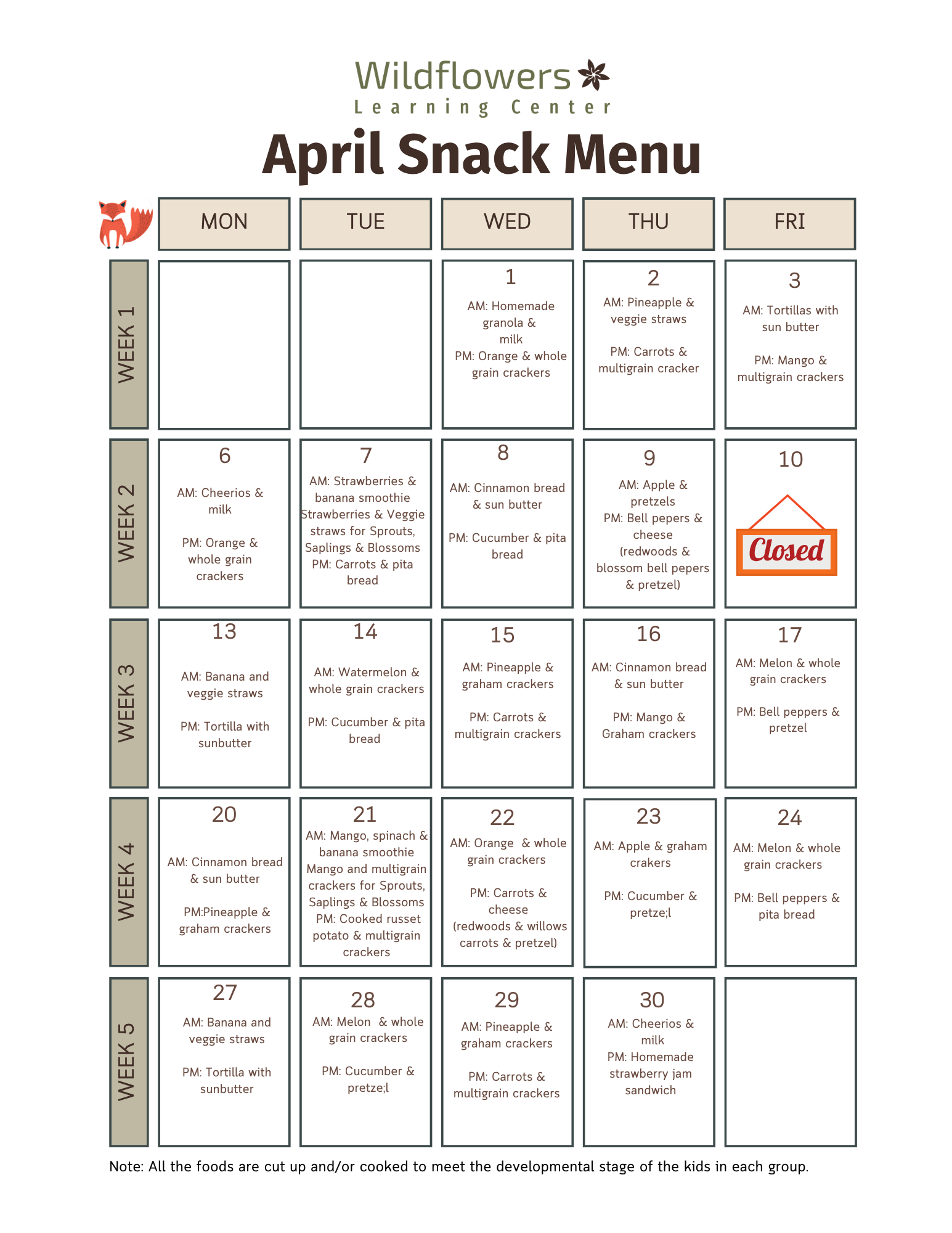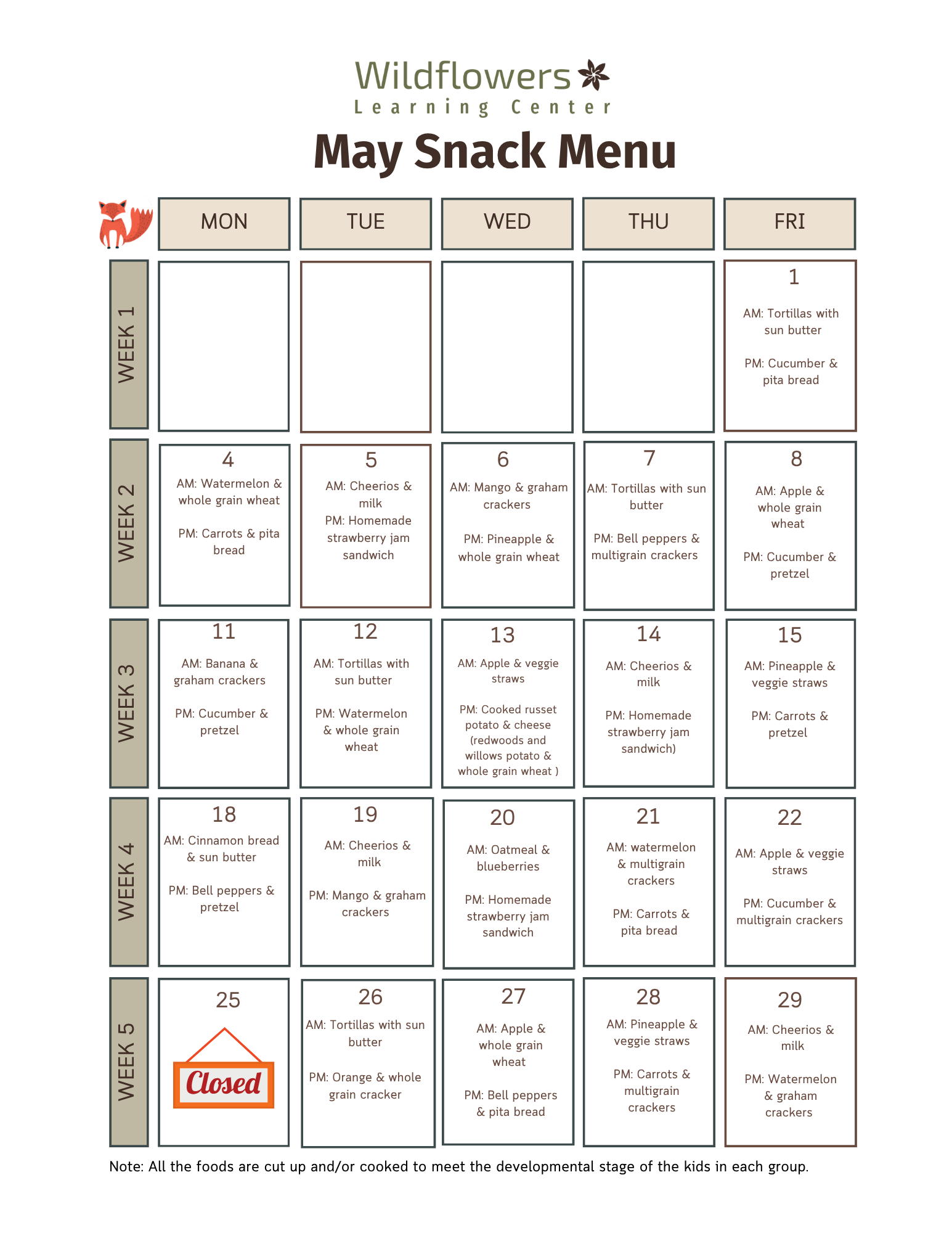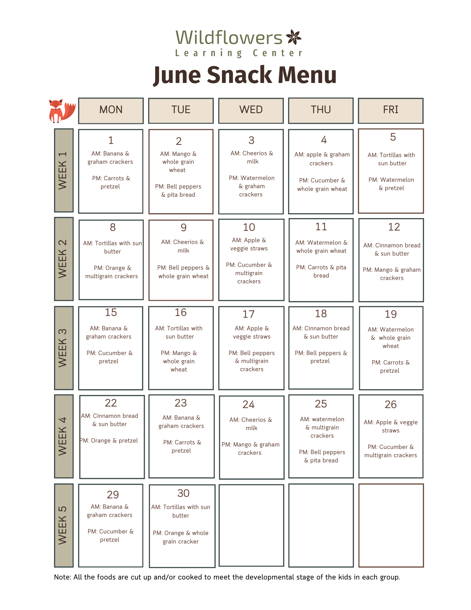 Monthly Snack Menus